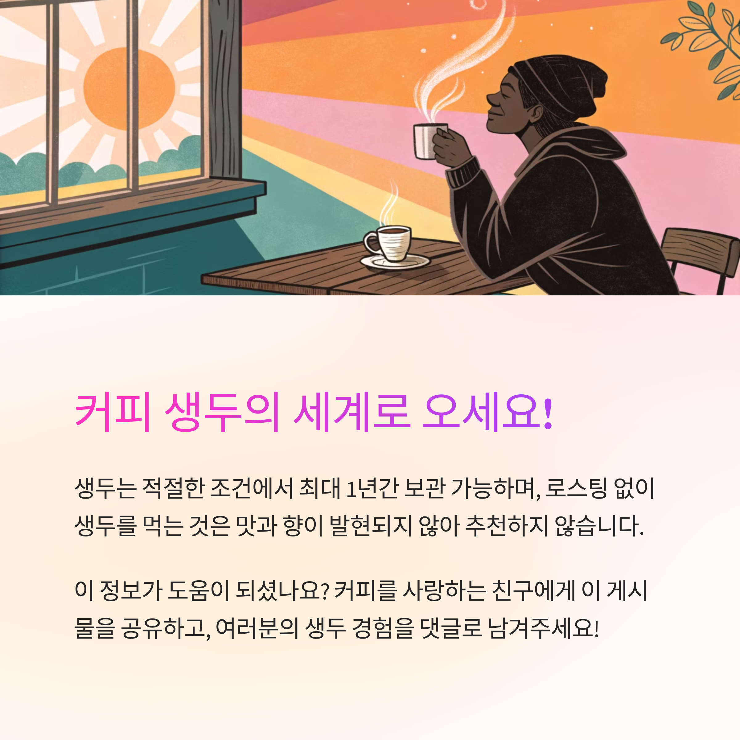 생두를 잘 고르면, 홈로스팅의 성공 확률이 확 올라가요. 구매 전에는 꼭 상세 정보, 후기, 포장 상태, 고객 응대 등을 종합적으로 보고 판단하세요. 좋은 생두는 향부터 다르답니다!